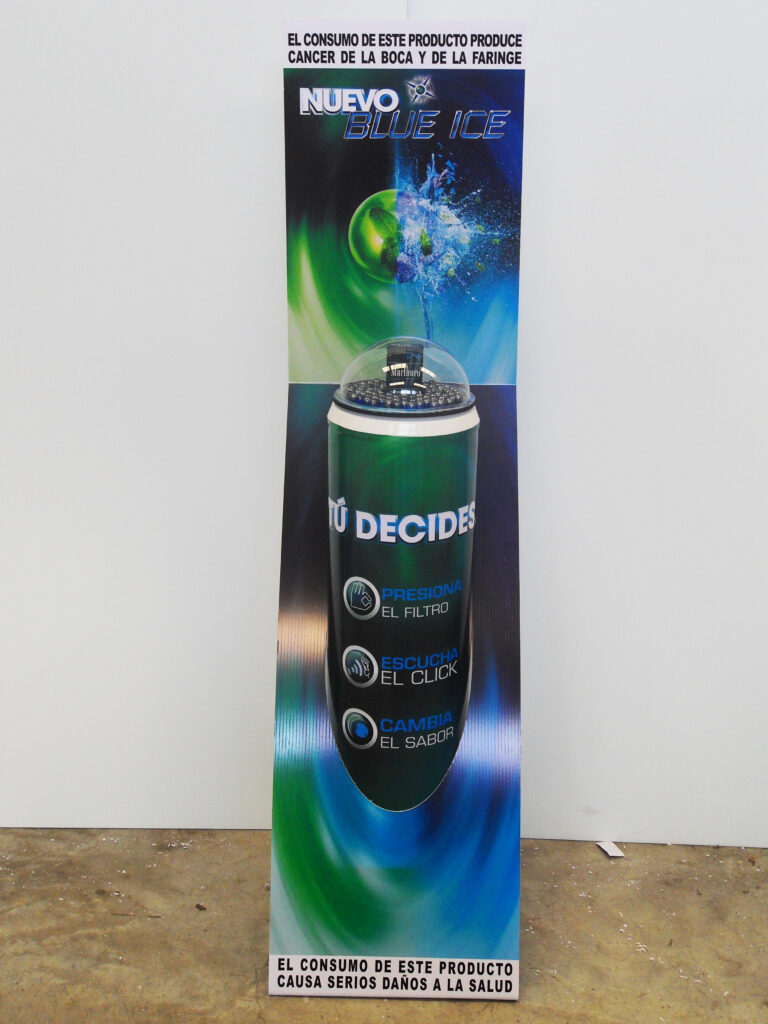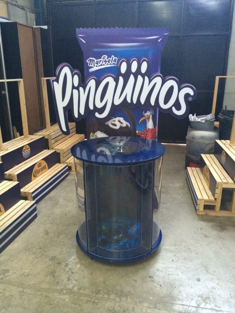 Fabricados en acrílico, PVC, cartón o madera laminada, cuentan con gráficos de impresión digital en alta resolución, iluminación LED opcional y estructuras personalizables según las necesidades de cada cliente.
