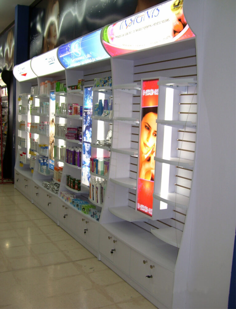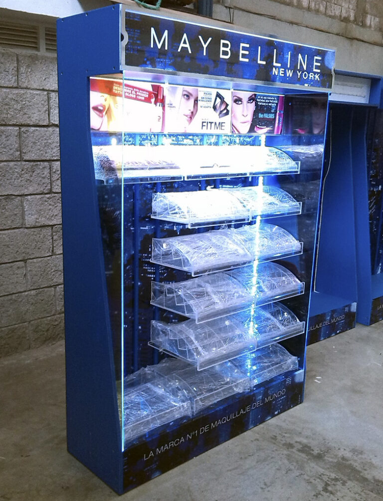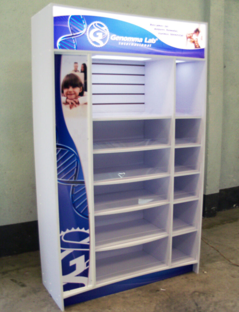 Fabricados con metal, aglomerados de madera o acrílico resistente, incluyen repisas ajustables, bases estables y opciones de personalización con impresión digital de alta resolución. Opcionalmente, pueden integrar iluminación LED para resaltar los productos exhibidos.
